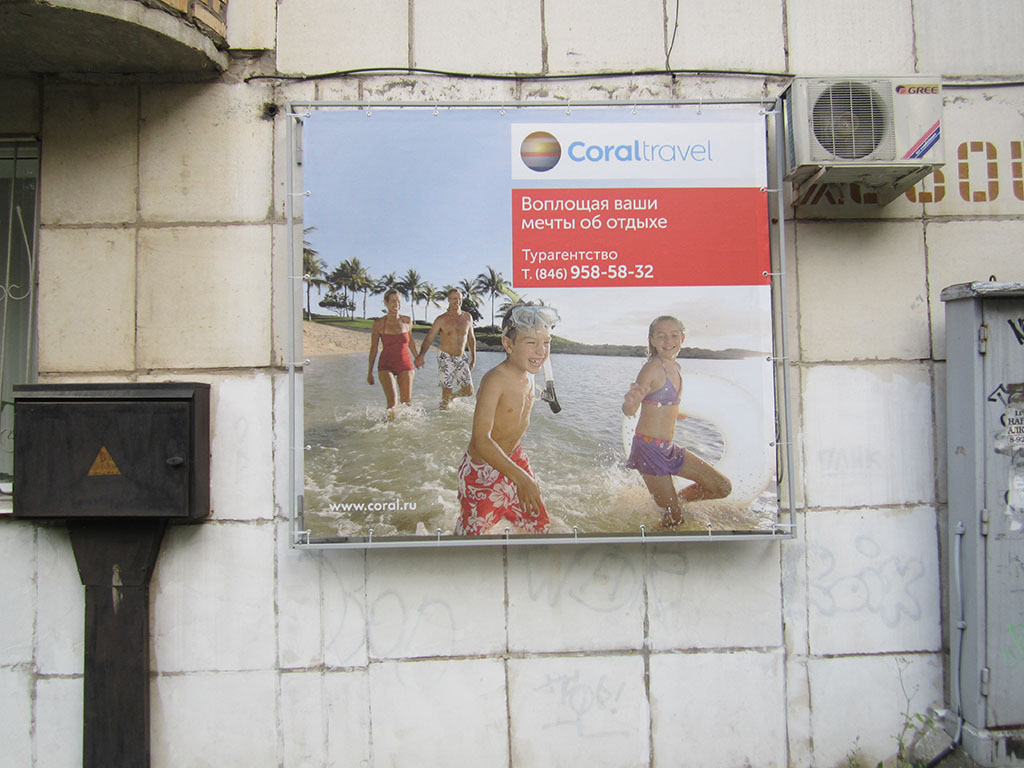 Изображение печатается на баннерной ткани различной плотности (в основном 330 г, 440 г и 510 г.) и монтируется либо на каркас, либо непосредственно на фасад здания или иной объект. Крепление осуществляется как правило через люверсы с помощью веревки или дюбелей. После монтажа баннер может быть обрамлен по периметру металлическим профилем для придания более законченного вида.